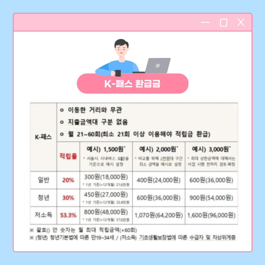 위와 같이 K-패스 카드를 사용하게 되면 최대 9만6000원의 교통비 절감 효과가 날 수 있습니다.