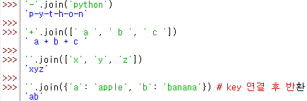 인수로 전달한 반복가능객체의 각 요소 사이에 문자열을 포함시켜 새로운 문자열을 만들고 그 결과를 반환