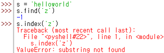 find() 메소드와 같지만 찾는 문자열이 없는 경우 오류 발생
