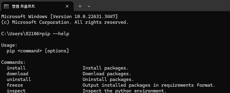 파이썬 설치 시 Add python.exe to PATH 체크했으면 바로 "pip" 사용 가능