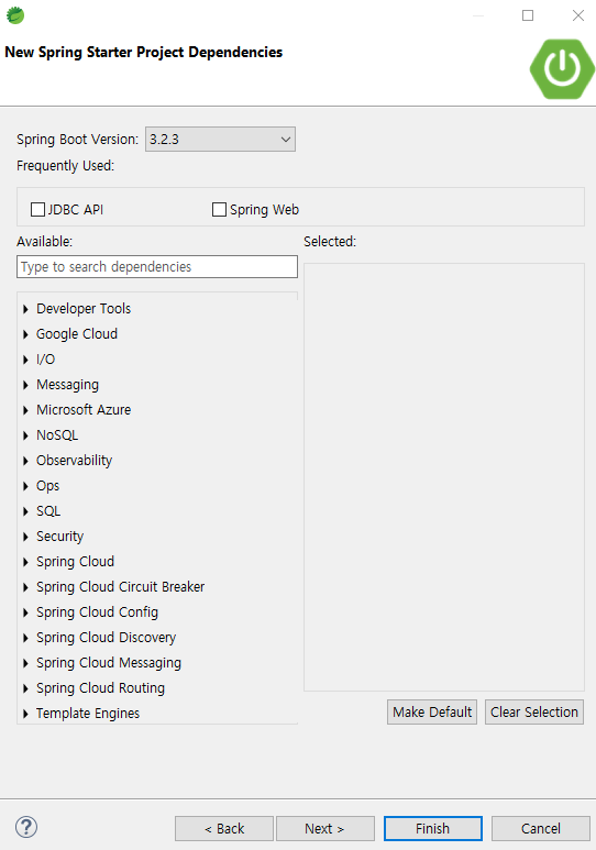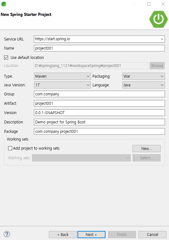 - Packaging : War(웹 배포) / Jar(자바 아카이브 배포)